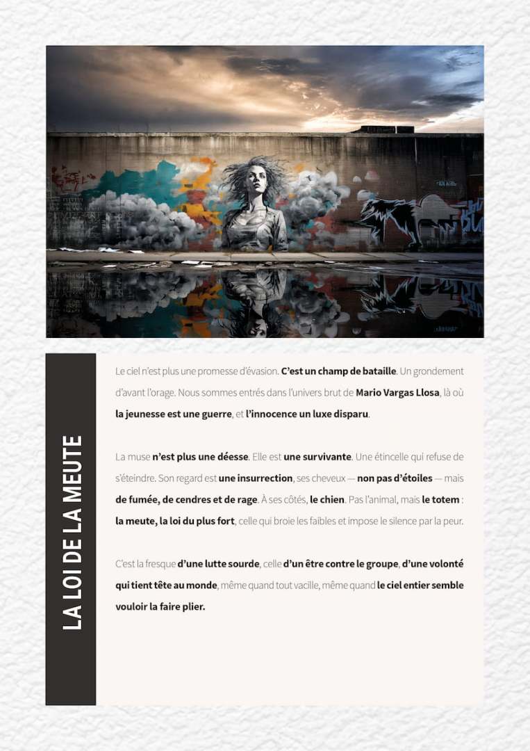 stormy mural of a fierce woman and wolves in a cityscape
