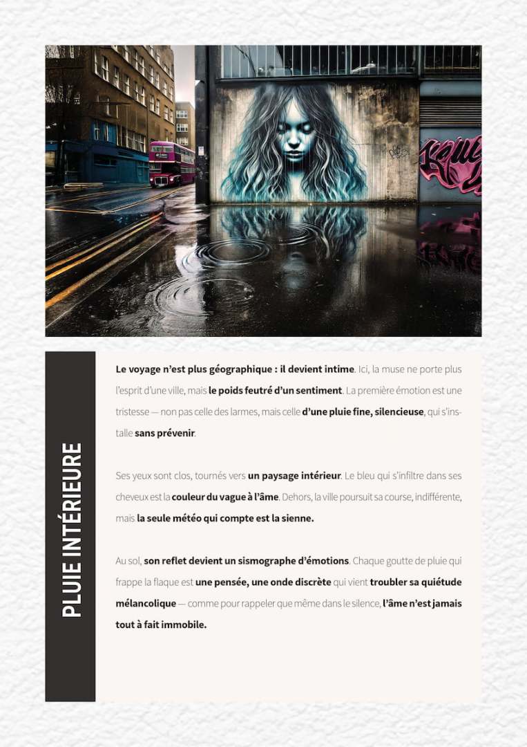 Prenons Pluie Intérieure par exemple — la tristesse dans ses yeux fermés, le reflet tremblant dans une flaque, la crasse londonienne — tout est orchestré pour sembler réel, même si cela n’a jamais existé.