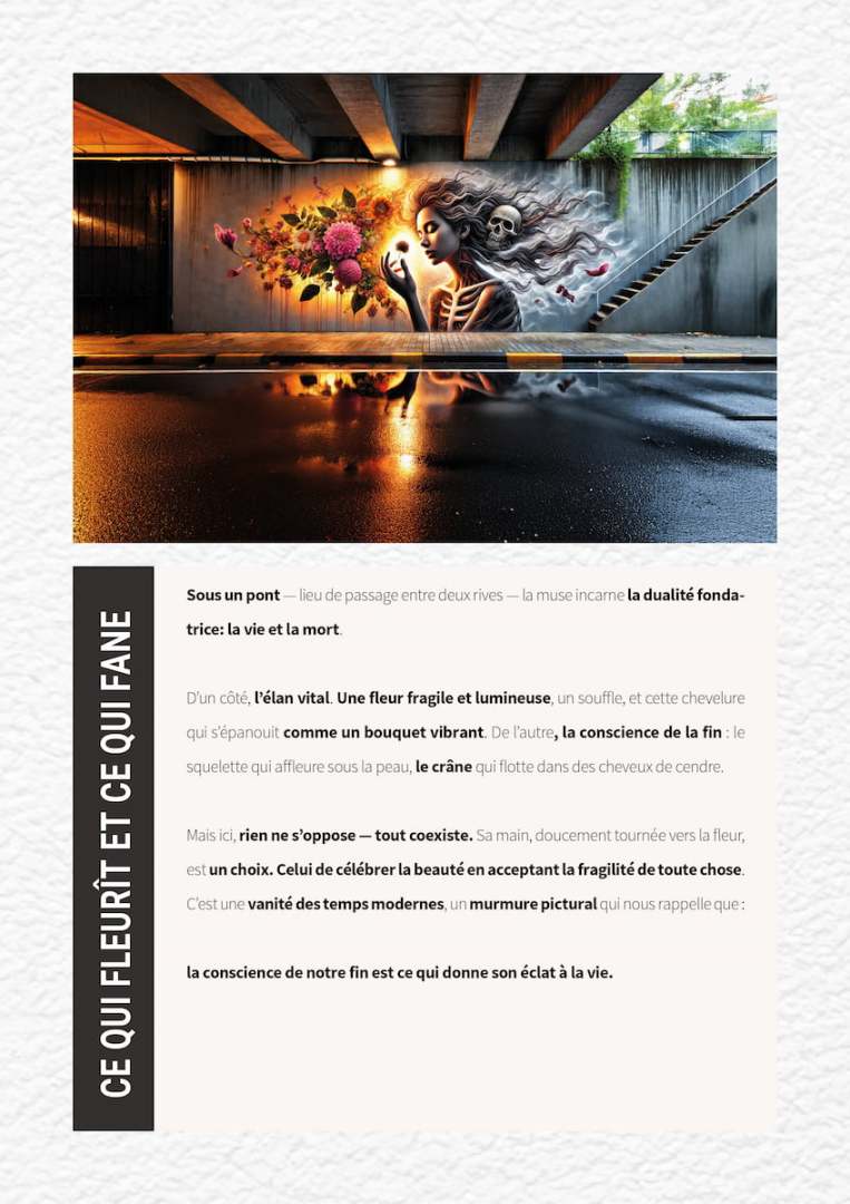 Sous un pont en béton, une fresque murale révèle la frontière fragile entre l'épanouissement et la décomposition. Une fleur éclatante rayonne dans une main ; un crâne flotte dans des cheveux semblables à des cendres. La vie et la mort s'entremêlent, non pas en opposition, mais en harmonie, nous rappelant que la beauté tire son sens de son caractère éphémère.